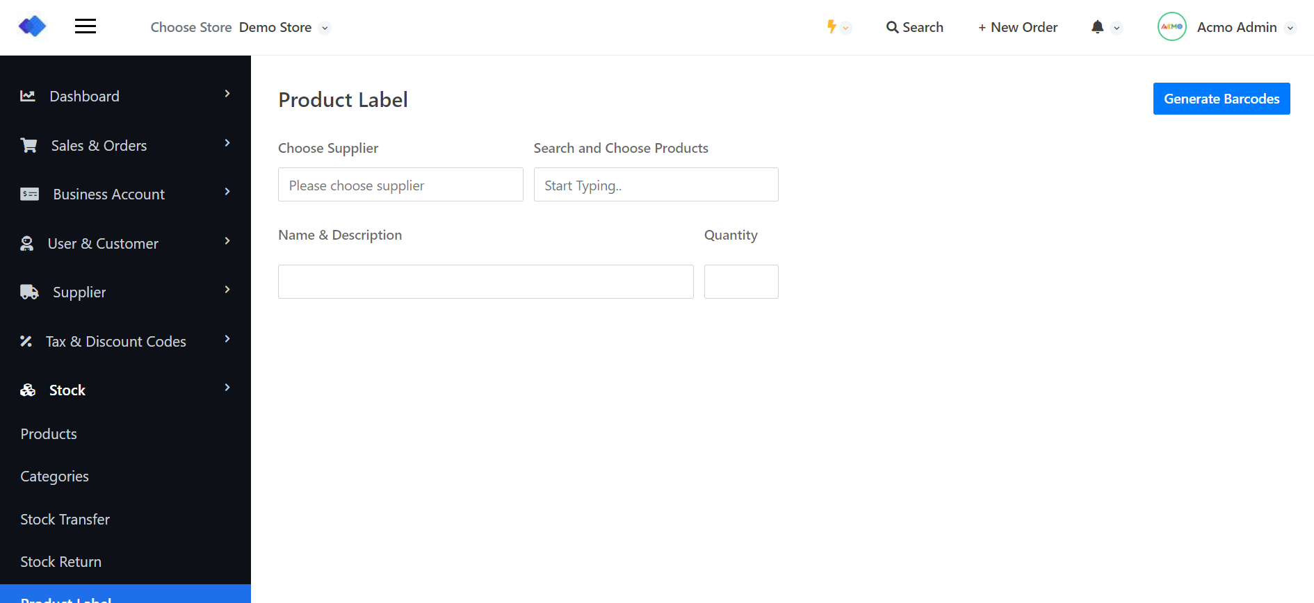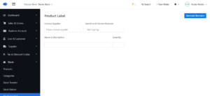 Generate Product Barcode Navigate to Stock > Product Label 1. Choose Supplier 2. Search and choose product. 3. Add quantity and generate Barcode. Updated on June 24, 2024 Tagged: BarcodingInventory TrackingProduct Identification Was this article helpful? Yes No Related Articles How to Manage Variant Options? How to Manage Categories and Products